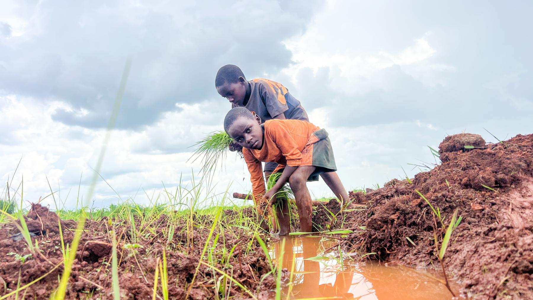 In the heart of the countryside, under a vast sky heavy with clouds, two young children bend low over the wet soil—planting rice with steady hands and quiet determination. This is not just farming; it's survival, tradition, and responsibility passed on too early. Their small fingers carry the weight of daily bread in many rural communities. While most children their age are in classrooms or at play, these two work the land—reminding us of the harsh realities many children face across the globe.